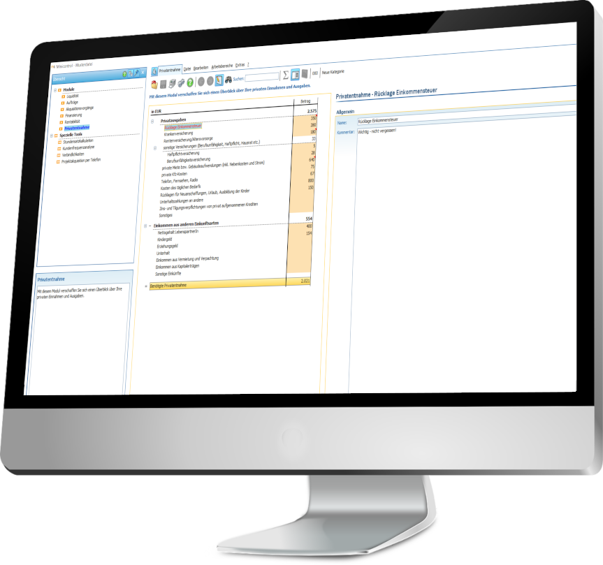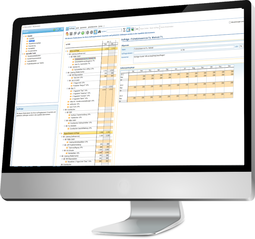 Im Mittelpunkt der Minicontrol-Software steht Ihre Liquiditätsplanung. Hier werden die Ein- und Auszahlungen Ihres Unternehmens erfasst und in Beziehung zu den liquiden Mitteln und zu Ihrer Privatentnahme gesetzt. Plandaten aus dem Modul "Aufträge" werden automatisch übernommen und erlauben realistische Prognosen für die nächsten Monate.