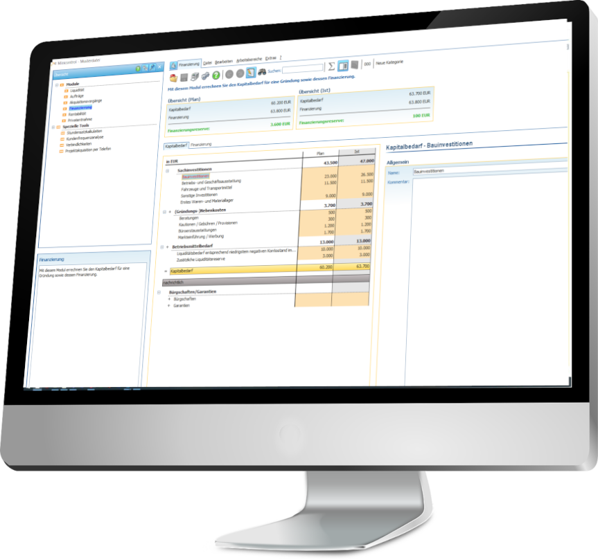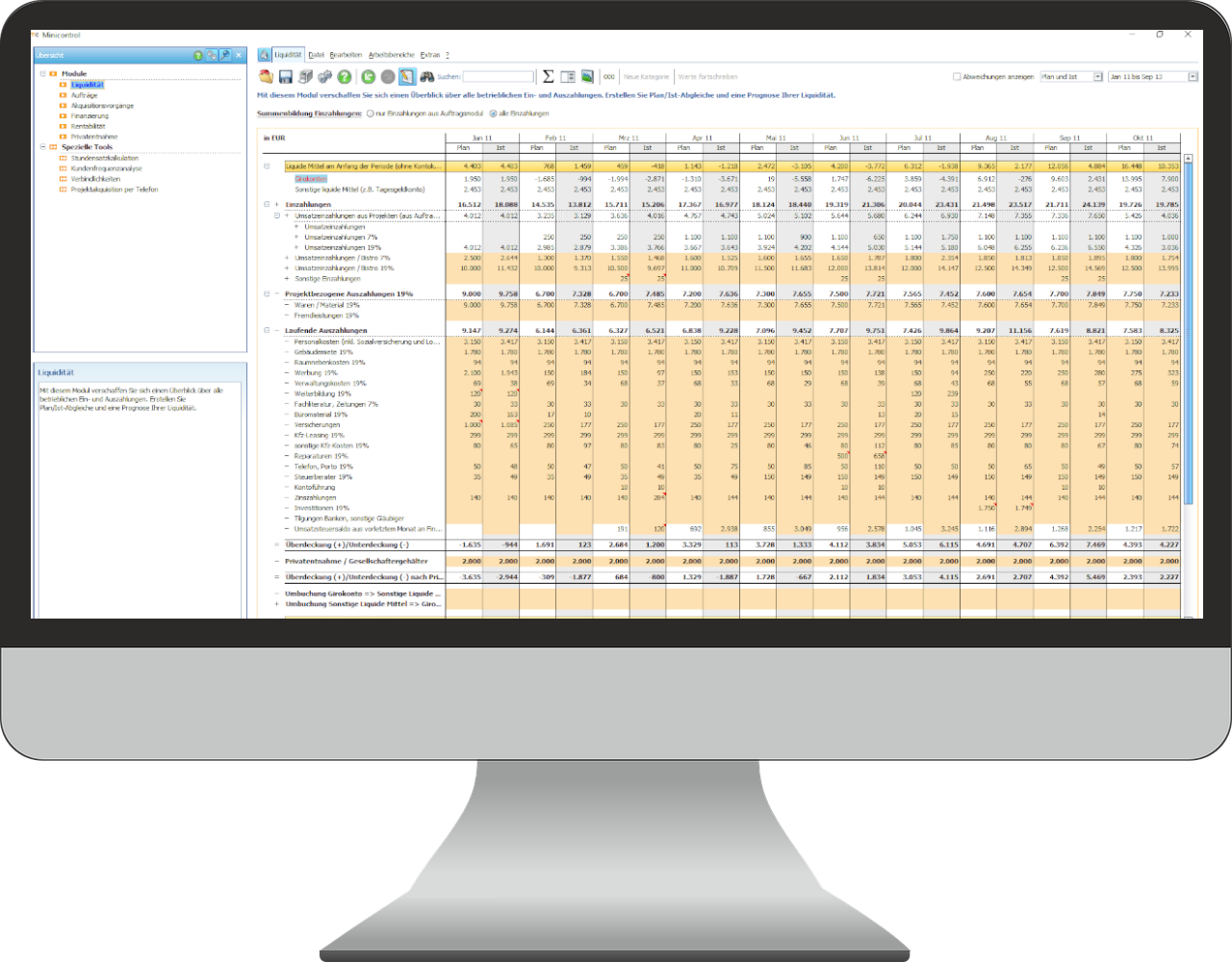 Minicontrol besteht aus Modulen, sodass Sie die Software sehr individuell benutzen können. Unverzichtbar ist insbesondere die Liquiditätsplanung, alle weiteren Module sollten Sie einsetzen, wenn es zu Ihrem Unternehmen passt.
